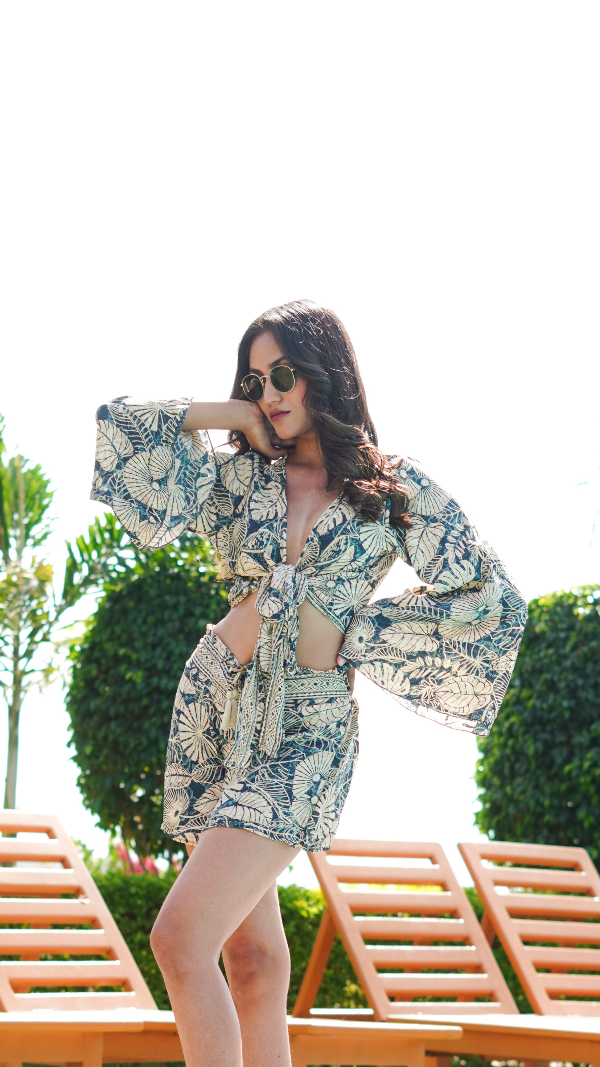 Wrap Top + Beach shorts (set) - Beige Leaf